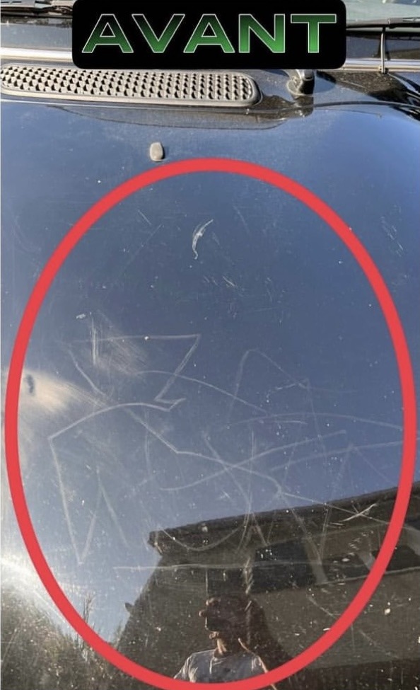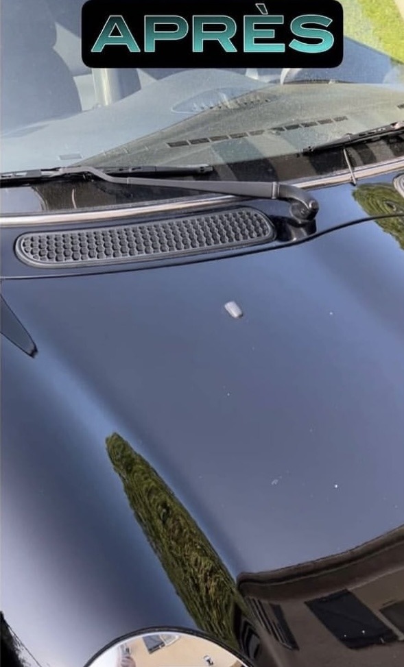Sur ce véhicule, nous avons effectué un polissage complet du capot afin de corriger les défauts visibles :